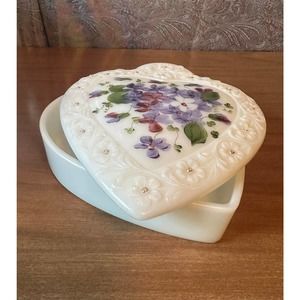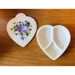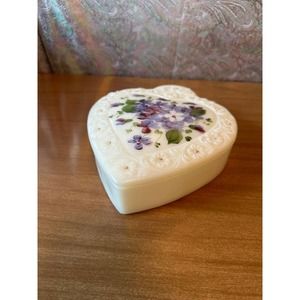 Vintage milkglass divided lidded heart shaped trinket dish hand-painted flowers
