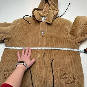 This jacket is so adorable! A little bit of a different fit, with cropped sleeves. I’m a women’s medium, and the jacket fits me great but sleeves are a few inches up past my wrist. Removable hood. Tag Says it’s a 5.