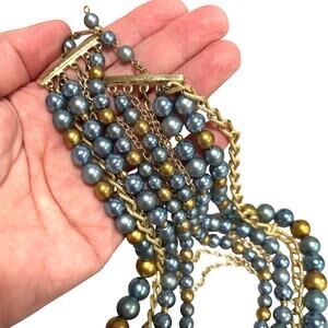 Vintage multistrand necklace signed Japan on the hook clasp - this piece is a dramatic beaded design with goldtone chains interspersed with the strands of blue & gold pearl-finish beads. Classic mid century look that really makes a statement! In good vintage condition - very wearable and certain to draw compliments every time you wear it!