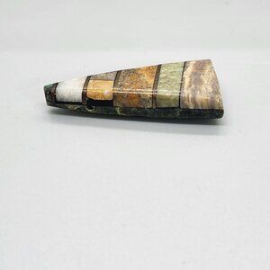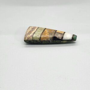 This Vintage Native American inlaid multi stone bead dangle pendant is a beautiful piece of handmade jewelry that represents the Navajo culture of the United States. The intricate design and use of multiple stones reflect the craftsmanship and heritage of the Native American people. Perfect for collectors or those looking to add a unique piece to their jewelry collection, this pendant is a stunning representation of Native American artistry and tradition.