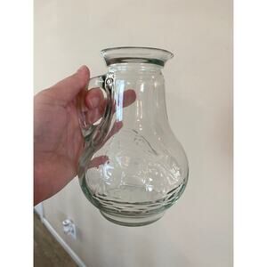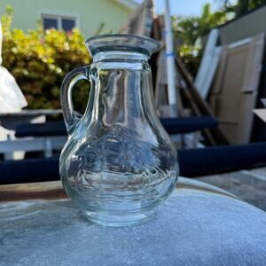 6.5" tall glass pitcher. perfect for strong tea, creamer, vase, anything served strong. Holds approximately 24 ounces of liquid.