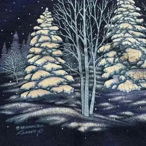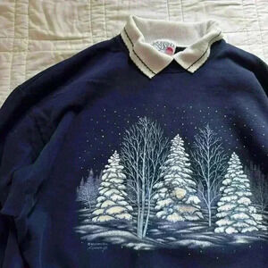 Vintage navy blue winter graphic scalloped collar snowy women’s large grannycore