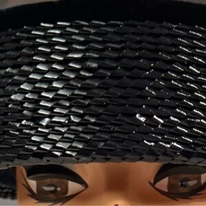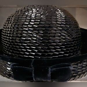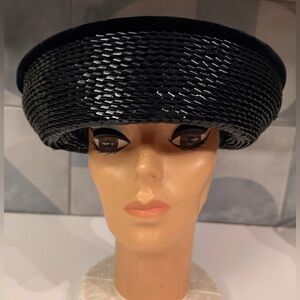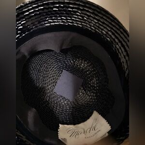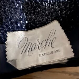 Vintage Marche' navy blue woven hat with velvet trim and velvet bow in back. Nautical style. Light misshape at some of hat- Does not show while wearing. The tag indicates it is probably 60s. Size small hat.