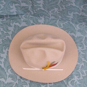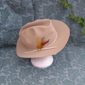 The timeless cowboy hat style will make you look and feel like a true cowboy, whether you're out on the ranch or just running errands around town. Made from genuine beaver fur with feather accents, this vintage hat is both stylish and durable. The hat comes in a size 7 1/8 and is handmade in the United States. It's perfect for any season, whether you're wearing it to keep warm in the winter or to shield your face from the sun in the summer. With its solid pattern and western theme, this cowboy hat is sure to make a statement wherever you go. Hat only as shown, no box.