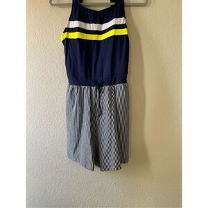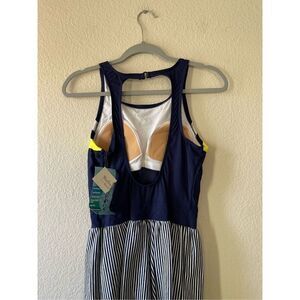 No flaws. It is brand new with tags. Very modest and retro look. Built in padding. Tag says a size 14 but it really fits like a small based on measurements.