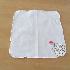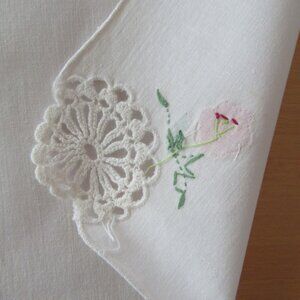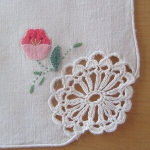 Sweet napkins are 10" x 10 1/2" and in excellent condition. This is a set of 6. One corner is crocheted with a two tone pink appliqued flower and embroidery. There are no tags but we believe these are cotton or a cotton blend. Wash in cold water, delicate cycle, and warm dry.