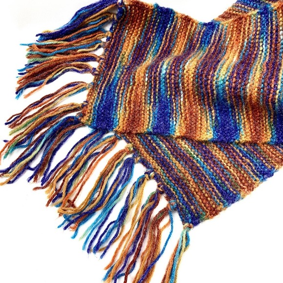 Vintage ombre rainbow hand made crochet scarf. Beautiful shades of blue, orange, purple and yellow. Tassel detail on ends. Measures 8.5" wide and 64" end to end (without tassels). Beautiful condition.