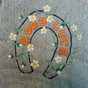 Harry Potter, Pirates of the Caribbean, French scissors, ironic good luck, sugar skull, and winged heart embroidery. Frayed hem.