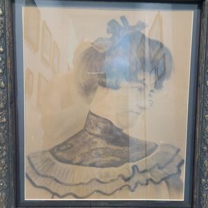 This vintage or antique portrait of a woman features a muted palette in an ornate frame with matting. The large print showcases a portrait orientation, measuring 19.5" wide and 21.5" tall with a depth of 2". The one-of-a-kind piece is perfect for art enthusiasts looking to add a unique and elegant touch to their collection. This timeless portrait captures the essence of classic portraiture, making it a standout addition to any home.