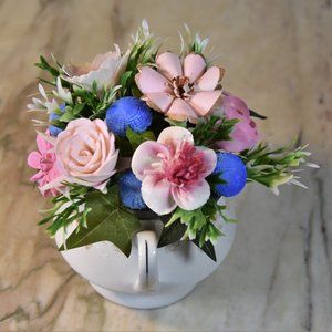 Vintage sugar bowl with no lid, floral design on china filled, upcycled with small Sola wood flowers airbrused in coordinating colors arranged with fillers secured in floral foam.