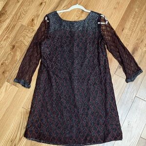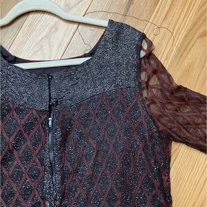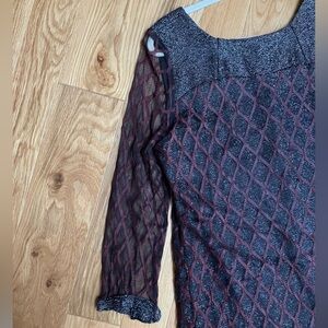 Vintage shift dress with base material of black with silver threading. Overlay is black mesh with maroon diamond pattern. Appears hand made! All material has generous stretch!
