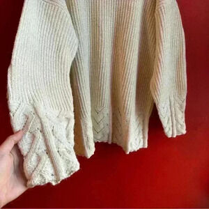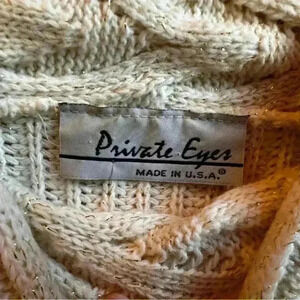 Vintage oversize thick cream sweater with gold lurex throughout. The brand is Private Eyes. No size tag but I'm recommending for a Large or possibly XL, please use measurements for sizing accuracy. Can be worn by smaller sizes for a more loose, relaxed fit. It is also long and can probably be worn as a sweater dress style for some.