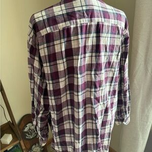This Towncraft button down shirt features a striking plaid pattern in deep purple and white, making it a stylish choice for casual occasions. The long-sleeved design offers a relaxed fit, perfect for comfort and ease of movement.