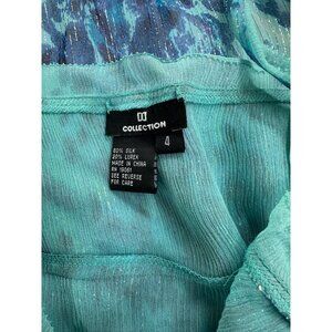 Gorgeous crinkle silk chiffon 3-pce set in a painterly watercolor print. There are shiny gold lurex stripes throughout the fabric. The set includes a skirt with six gores that flows beautifully. It is lined with a turquoise solid silk fabric which peaks out an inch below the hem. It zips up the left side and closes at the waist with a small button. The top features a sweetheart neckline and empire waist. The straps show both the printed fabric and the solid turquoise, which also trims the bodice and the hem. It zips up the side with an invisible zipper. The shawl is unlined but piped along the edges with the turquoise fabric. The set is in excellent condition.