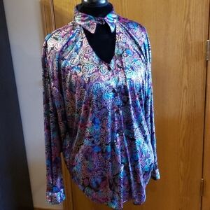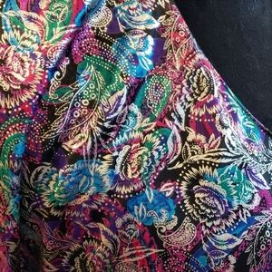 Metallic top with multicolored floral pattern. Ultimate business in the front party in back vintage shirt. Back is an open drape front is a keyhole neckline. Also has the required shoulder pads for its original time produced size large. Like comfortable satin style material.