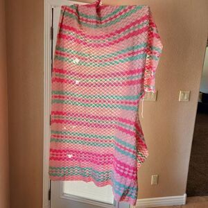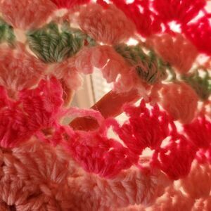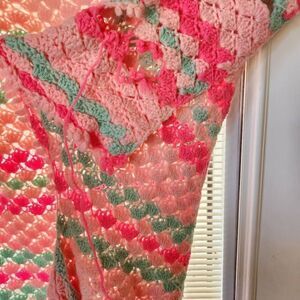 Vintage pastel shell pattern crochet handmade blanket large pink green striped t