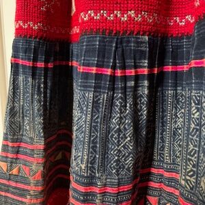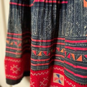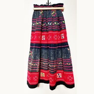 Trendy! Gorgeous statement vintage piece in good condition. No flaws. 63/37 cotton/poly, lining acetate/rayon. Dry clean only. Dark blue with lovely detailing along hem. Elastic waist max expands. Size M.