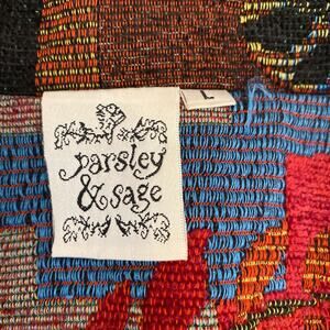 Vintage 2000s Multi-coloured patchwork jacket with sequins, featuring a button-up front and two front pockets jacket. Is missing bottom button, only has one up top. Thick material. Brand is Parsley & sage