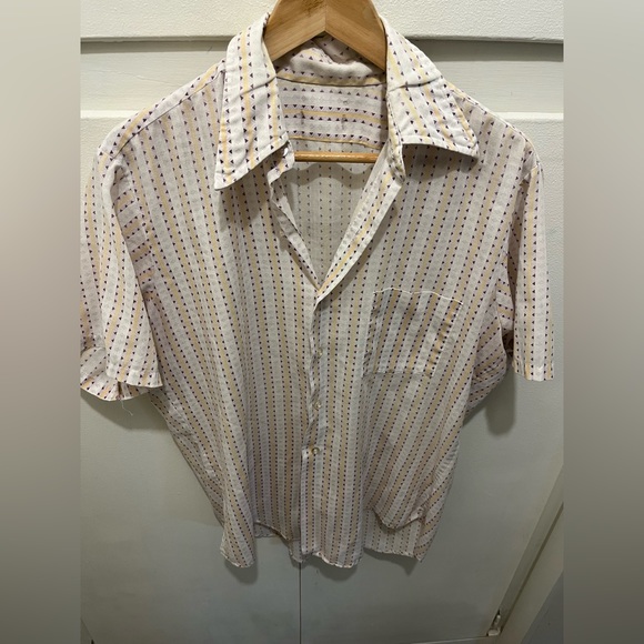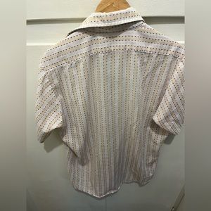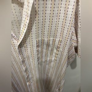 Vintage super soft men’s button up shirt. Purple triangle pattern with tan and grey patterning details all over. Original label cut off. Unsure of fabric but it’s very lightweight and soft! No size tag but fits a men’s medium