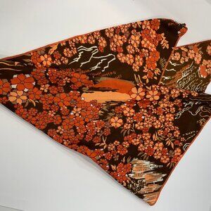Vintage triangular scarf--about 42 inches on longest side, and about 30 inches on the other two sides. Has a 1960s/1970s retro look. Pattern is brown and orange.