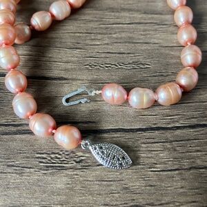 Vintage peach / light salmon pink faux pearl baroque choker necklace. It measures about 16" long including an ornate silver tone hook clasp.