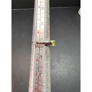 Three authentic peridot round cut gemstones prong set in genuine 925 sterling silver that’s plated with platinum or rhodium. Measures a size 7. Stamped HT which is an unknown hallmark to me but I believe this was a QVC design. Made in China early 2000’s era.