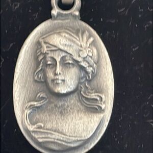 This exquisite pewter silver pendant showcases a beautifully detailed classical-style portrait, elegantly carved into its oval shape. The pendant's light, matte finish highlights the intricate design, making it a timeless piece of jewelry. Perfect for adding a touch of sophistication to any ensemble, it features a convenient bail for easy attachment to your favorite chain.