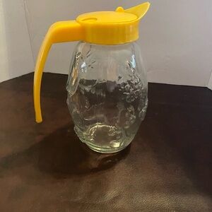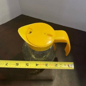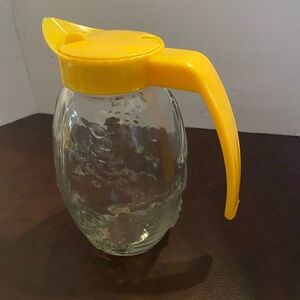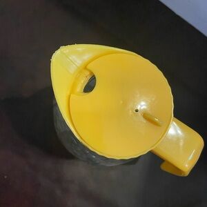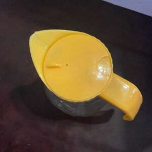 Solmaz Mercan juice carafe. Glass with plastic yellow top. Some rough edges on lid. Glass has fruit and is in great condition.