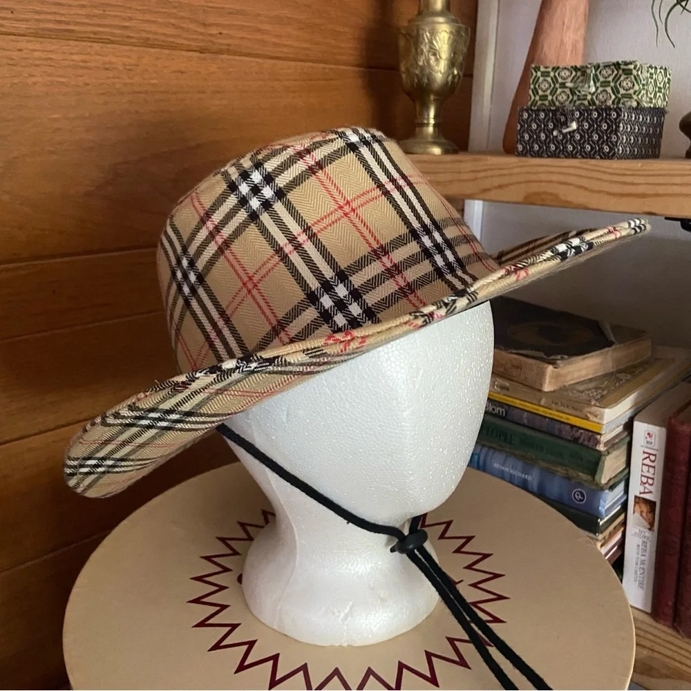 Vintage plaid check western style hat. Tan and red check pattern with drawstring. Great used condition. Approximately 24 inch circumference head opening and 13 inch diameter.