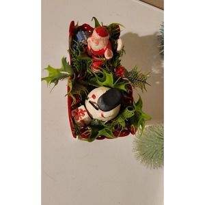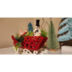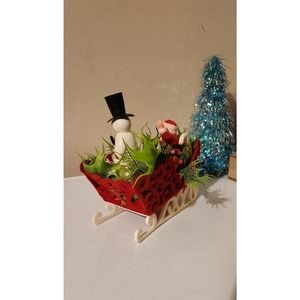 Vintage table or shelf decor, very cute and very old but well kept Christmas decoration. This is a red and white sleigh of plastic and velvet coated, with a Santa and snowman and fake plants. This is very old and has great character. Beautiful piece of antique Christmas great for the centerpiece of your table or a shelf, mantle, piano, kitchen counter or anywhere you want to make festive.