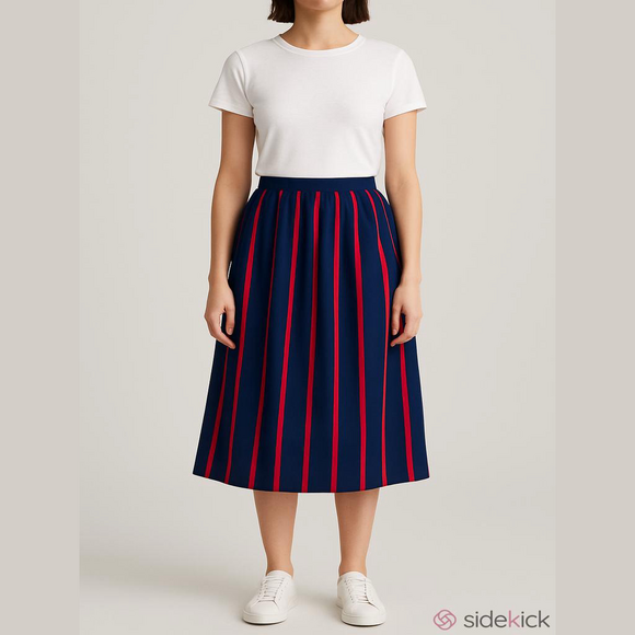Vintage pleated midi skirt • navy blue with red stripes • modest • 70s 80s • a line full pleated style