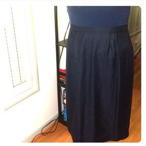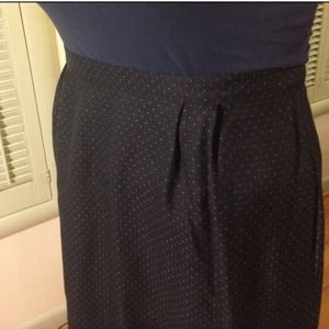 Navy blue with white polka dots. Zip up vlosure in back. 100% viscose rayon Waist- 32" hips- 44" length- 28.5"