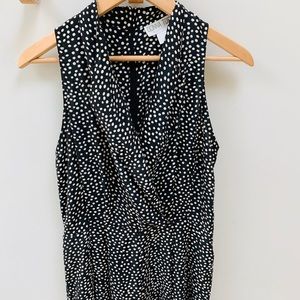 Vintage Donna Toran jumpsuit. Black and white polka dots. Sleeveless with wide legs- loose/draped fit. Measurements: shoulder to hem 50”; bust 36”; waist 29”. Zip closure in back. 100% polyester. Excellent condition.