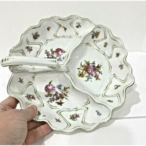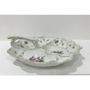 Vintage porcelain center handle server bowl 3-part vegie display white & floral