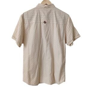 vintage prana men's shirt size large well cared for vintage piece from prana button down short sleeve collared shirt 65% organic cotton 35% polyester tan brown individual stitching single pocket front length 31. flat across underarm 22"