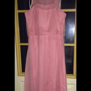 It's a very pretty pink dress with pleats on the front side and a cute little bow on its singed waist. It also has a very long matching scarf. The dress it self is so long it definitely calls for heals, and my mom had it since prom. It's still in the original dry cleaning bag and was only worn once!
