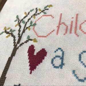 Counted cross stitch on linen, with two wooden beads in shape of children.