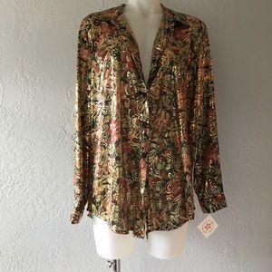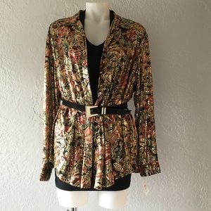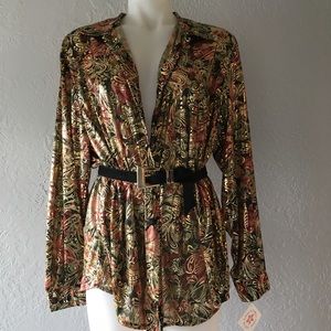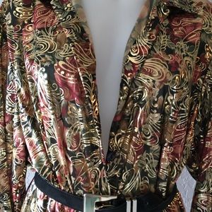Vintage printed gold metallic button up shirt dress. The fabric feels so soft and smooth. Real fancy look. Style it whenever u want. Fits S/M/L