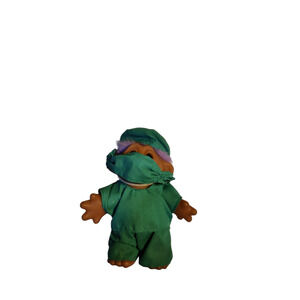 1. 1986 Dam Troll Surgeon Medical Doctor with purple hair and brown eyes in green scrubs and mask.