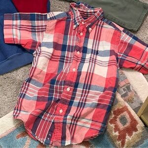 Stylish gap 90s blue hoodie with bold red sleeves . 100% Cotton Ralph Lauren striped long sleeve tee. 100% Cotton polo plaid short sleeve button down. Camo zip up vest old navy & cotton OshKosh B’gosh army style denim. Perfect for everyday wear.