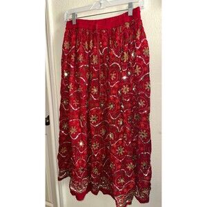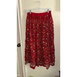 Vintage rayon indie boho sequin red floral printed flowy maxi skirt FREE SIZE