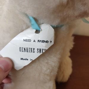 Vintage real Sheepskin Stuffed Lamb Animal White Blue Ribbon.