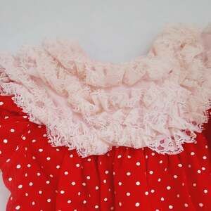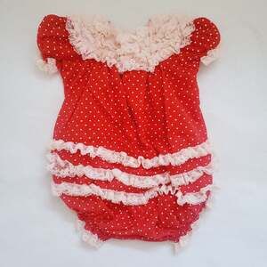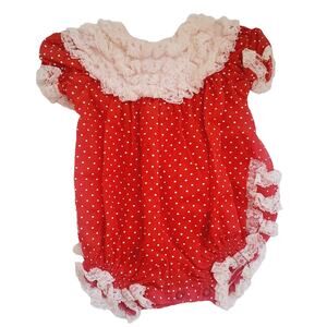 Vintage red polka dot bodysuit with ruffled pink lace trim on front and bottom. Excellent used condition. Adroable for Valentines Day. Size 0-3M.