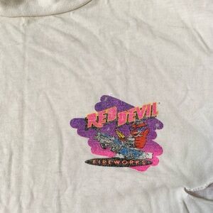 Vintage red devil fireworks shirt sleeve tee size small. Condition is a little rough, there are a couple tears on the tea as shown in pictures, also seam needs to be re-sold at the bottom as shown in picture. Super cool sign on the shirt and the rips and wear add character to it!