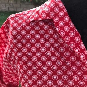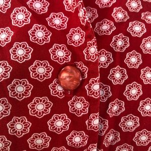 This adorable blouse! The sleeves are quite long and I think designed to Roll Up the sleeves as pictured. Side slits. Red marbley plastic buttons.