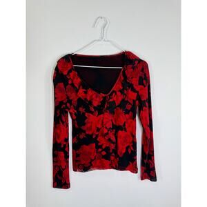 Elevate your wardrobe with this charming vintage red and black floral top! It features a feminine ruffled silhouette and is a women's size M. It is mesh but fully lined