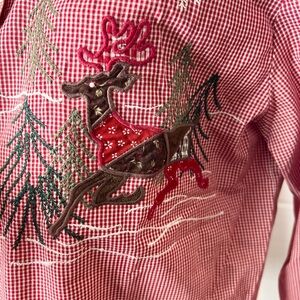 Vintage red gingham Christmas top button front Appliqués embroidery Deer snowman
