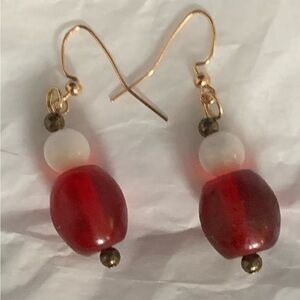 Hand crafted earrings- using vintage red glass beads, brass spacers on gold toned nickel free fish hook style ear wire - these dangle 2”