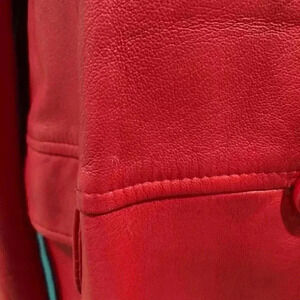 Vintage red leather trench coat in size large. Has some minor signs of wear such as small marks and fading on buttons. I don’t see a brand tag.