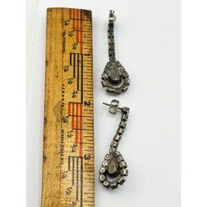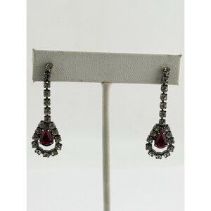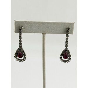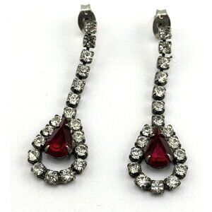 Vintage red rhinestone dangle drop earrings. Pierced earrings with prong set glass rhinestones, red rhinestone center. MN52GHN.